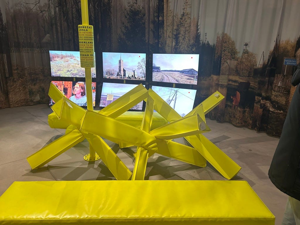 But it was Latvia’s that hit me hardest. Called “Landscape of Defence,” it consists of a video installation showing scenes from the eastern border, interspersed with snippets of interviews. You watch sitting against a pile of stylised anti-tank “hedgehog” defences, made from yellow vinyl cushions.