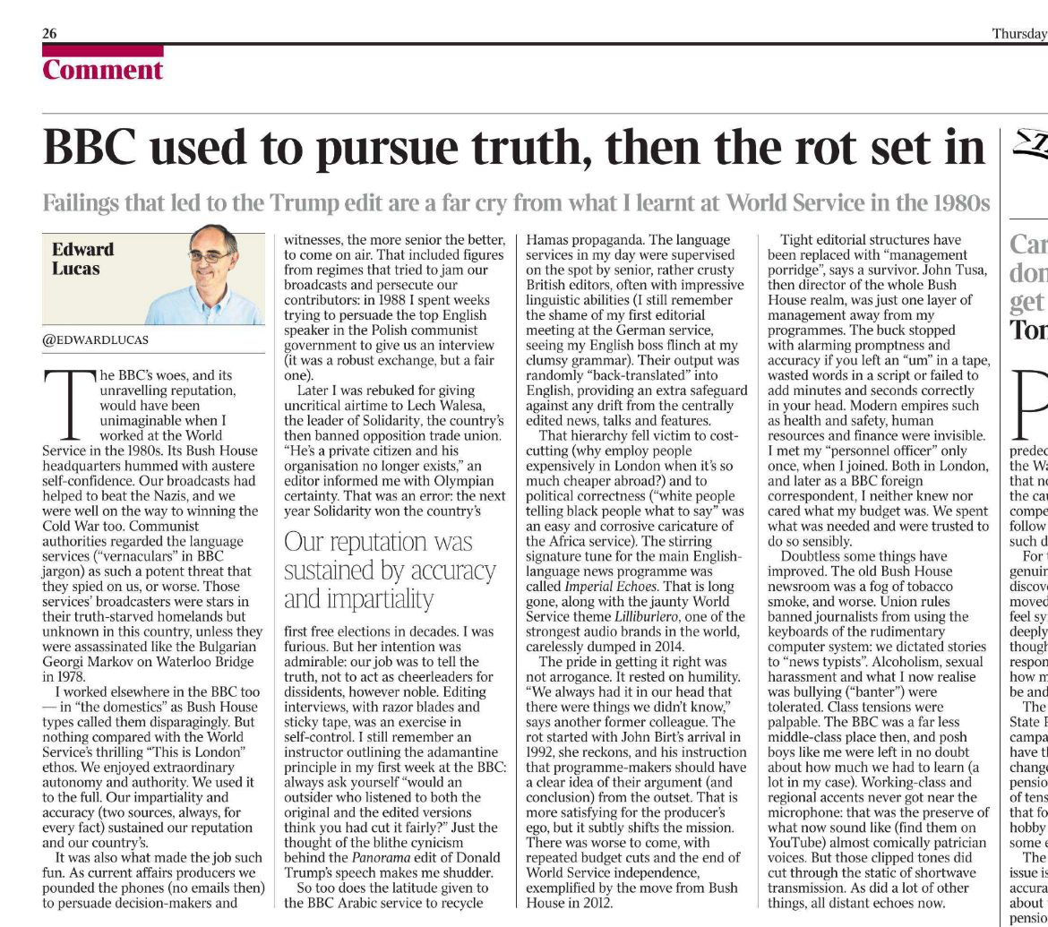 I listened to the BBC World Service for hours every day, including having it on all night long (a legacy of my days as a nervy foreign correspondent). Now I barely listen to it all — it’s just too painful to hear the sloppy edits, weak scripts, badly chosen items and stumbling presentation.